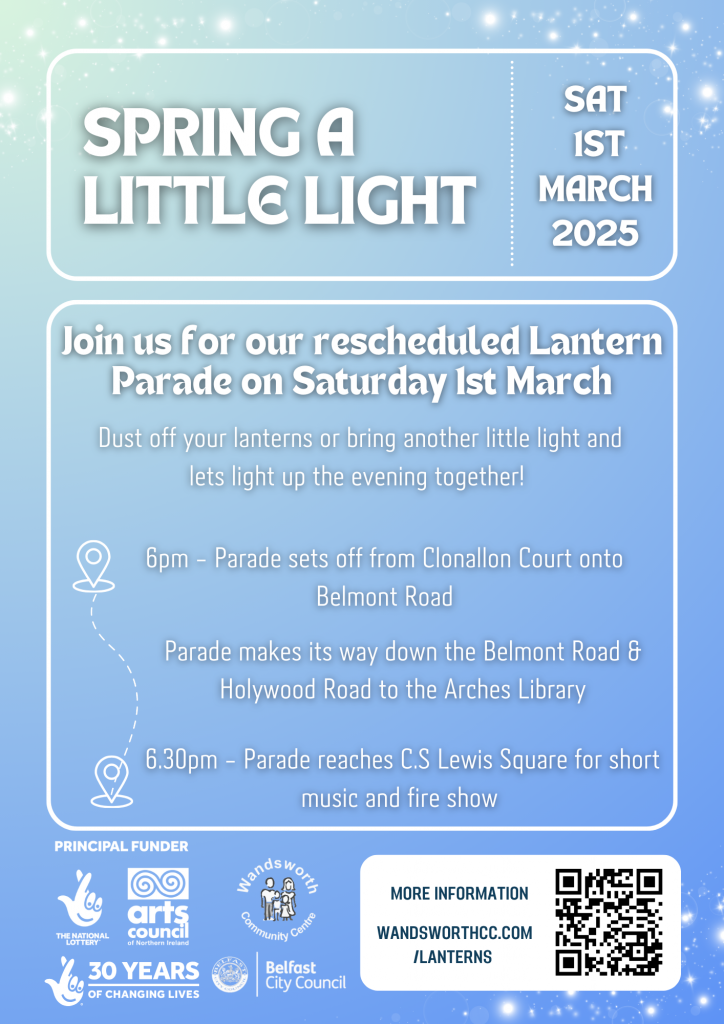 Join us on Saturday 1st March from 6pm as we make our way along the Belmont and Holywood Roads to C.S Lewis Square – bringing some light for Spring.